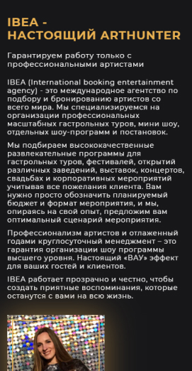 IBEA – компанія, яка займається підбирань артистів і організацією шоу в будь-якій точці світу.