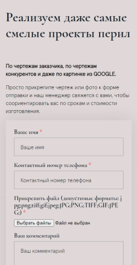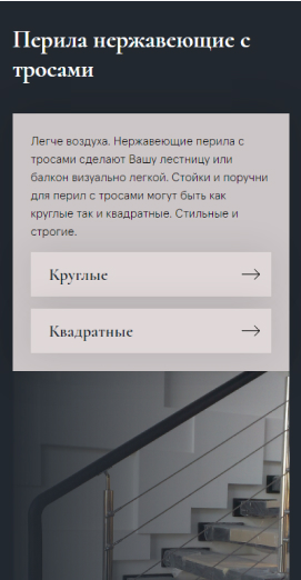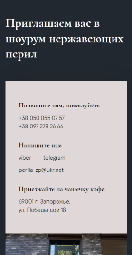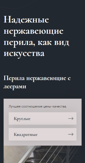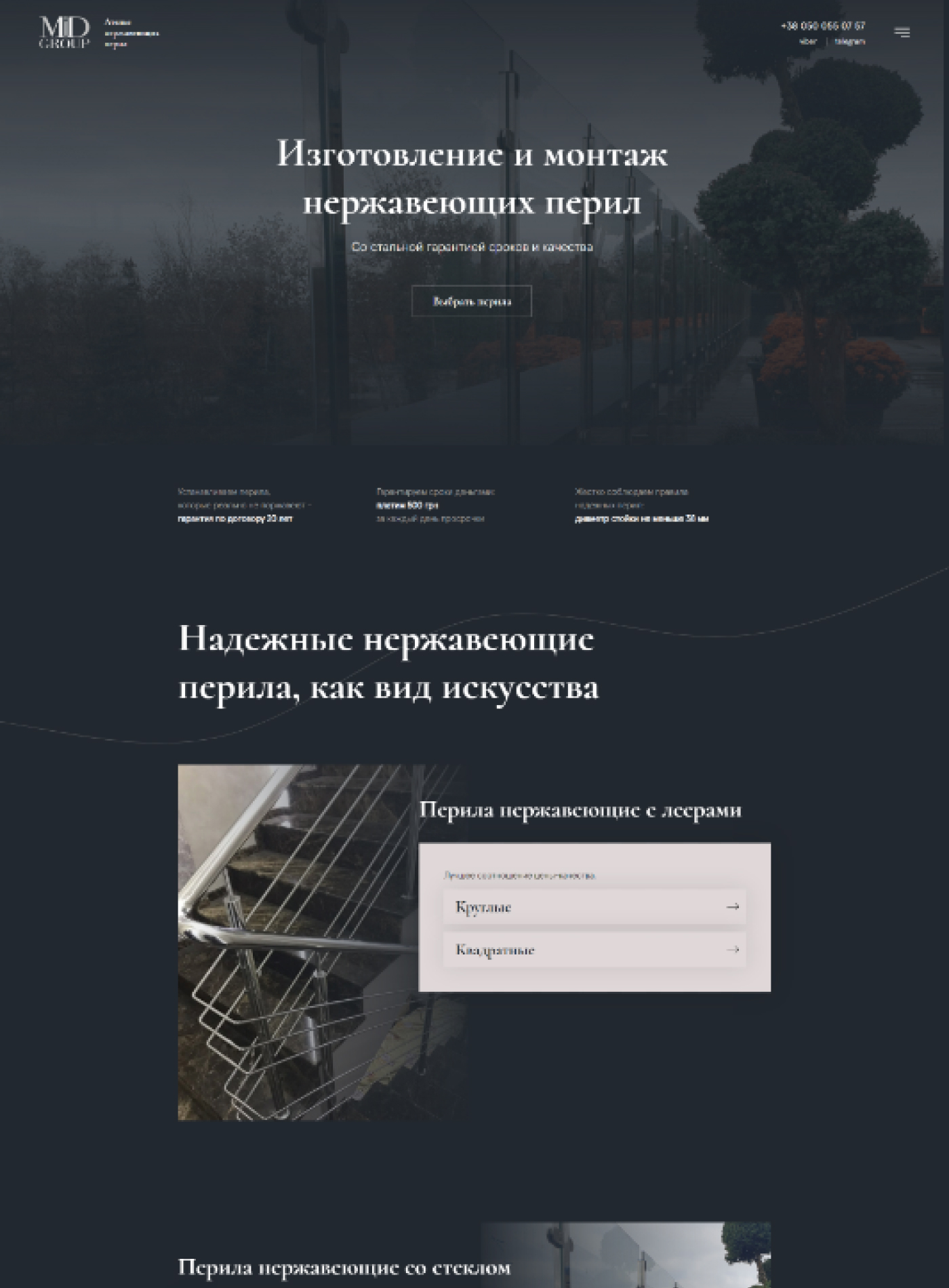 Рішенням даної задачі став сайт-каталог з великим асортиментом готових рішень. Головна сторінка була розроблена в форматі landing page, який відповідає на всі питання потенційного клієнта і закриває заперечення цільової аудиторії, після запуску рекламної компанії клієнт отримав потік заявок на виготовлення поручнів і огорож.